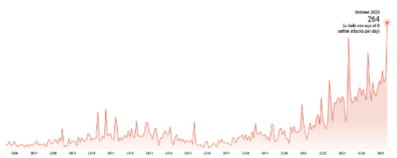 October 2025 recorded the highest monthly number of Israeli settler attacks since the UN Humanitarian office (OCHA) began documenting such incidents in 2006. That’s more than 260 attacks resulting in casualties, property damage or both – an average of eight incidents per day.